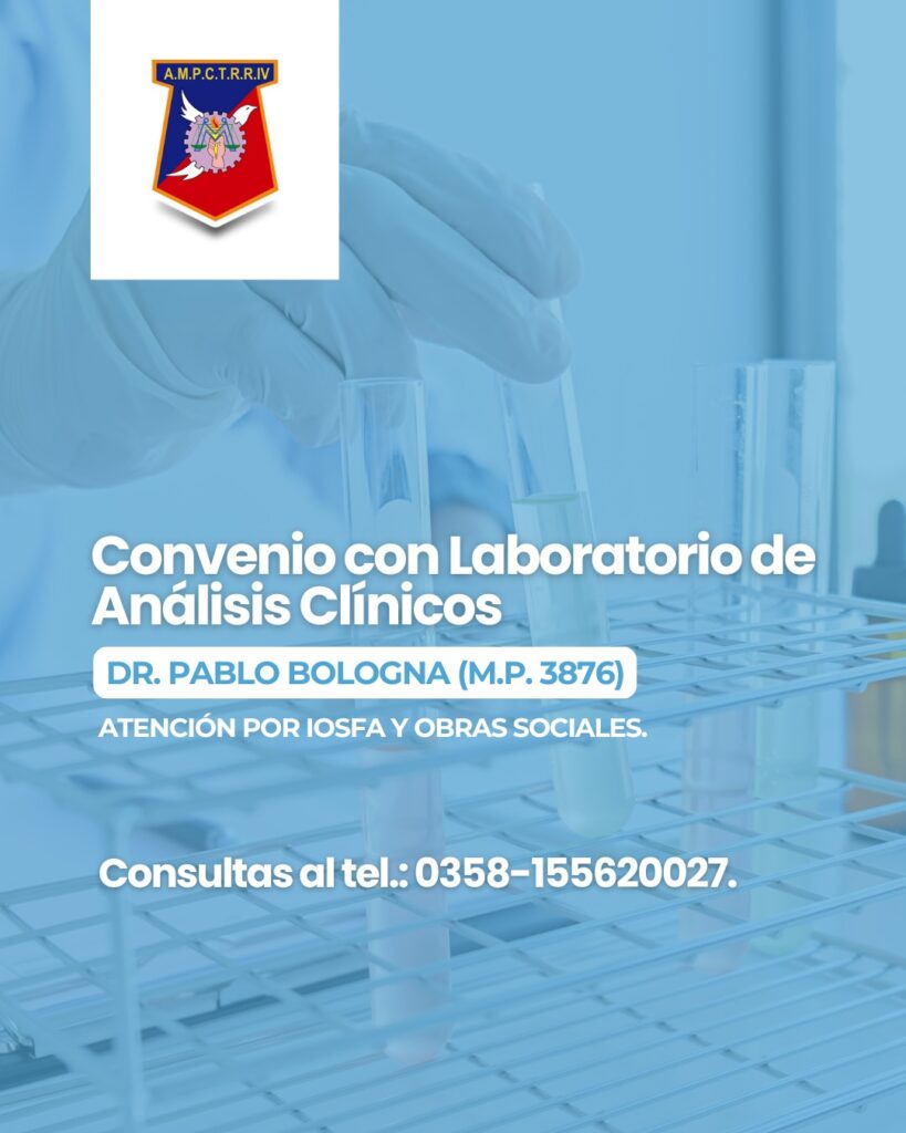 Mutual Personal Civil recuerda que nuestra entidad mantiene un convenio con el Laboratorio de Análisis Bioquímicos del Dr. Pablo Bologna (M.P. 3876), quien brinda atención en 25 de mayo 489. Cada paciente deberá concurrir con el pedido del médico solicitante.
